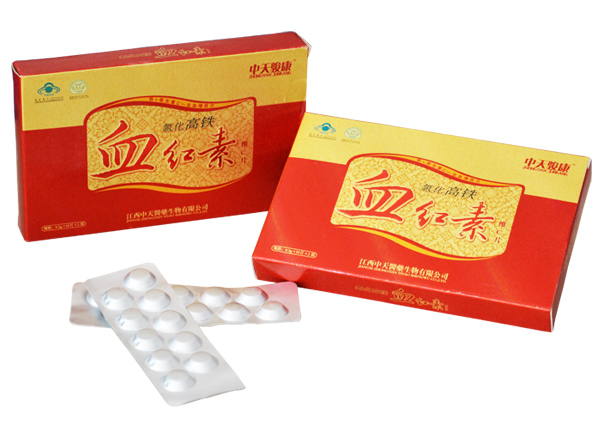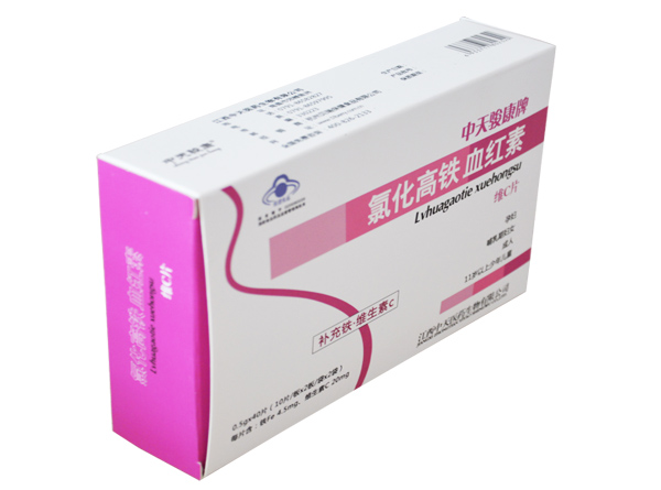 【产品名称】中天骏康牌氯化高铁血红素维c片【产品规格】0.5g/片×20片/盒【批准文号】国食健字g20080039【标志性成分及含量】每片含:铁 4.5mg、维生素c 20mg【食用方法及食用量】成人、孕早期及11-17岁少年儿童,每日1次,每次2片,直接食用;中晚期孕妇和哺乳期妇女,每日1次,每次3片,直接食用【保健功能】补充铁、维生素c【主要原料】氯化高铁血红素、维生素c、淀粉、微晶纤维素、硬脂酸镁【适宜人群】11岁以上少年儿童、成人、孕妇及哺乳期妇女需要补充铁和维生素c者